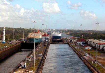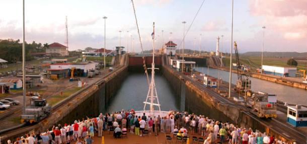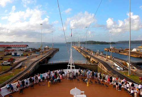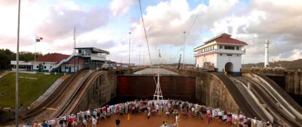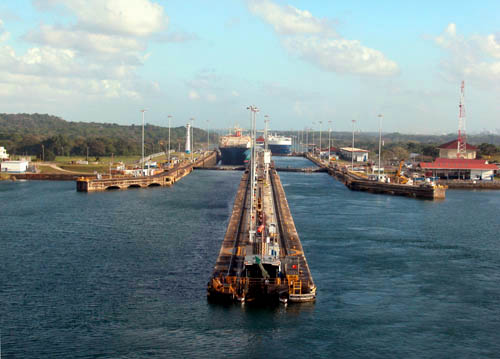 The gates are opening to allow us into Lock #3. Gatun Lake clearly visible in the distance.