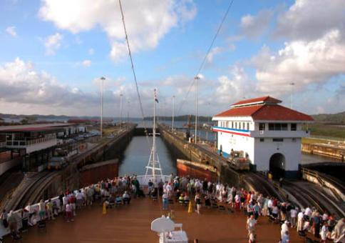 In these wide-angle views you can see the mules on both sides as they guide our ship into Gatun Lock #2.