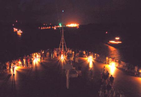 The first lines are brought out to the ship by two men in a rowboat - the same way it