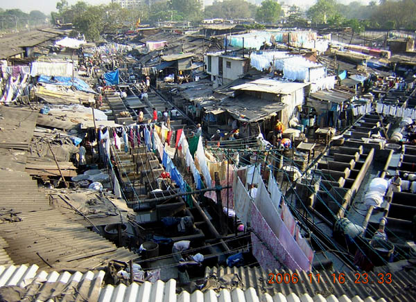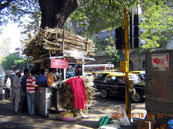 | Above: A Manual Laundry Facility in Mumbai (Bombay) - no high-tech equipment here. Left: Sugar cane piled high on a roadside stall. They are selling cane juice which is pressed from the cane by a device which looks like a hand-operated wringer washing machine. |