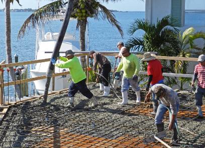 Big Pour completed... Forty-five yards of concrete - over 100 tons! Nine cement trucks - only half-full because of weight limit on causeway bridge.