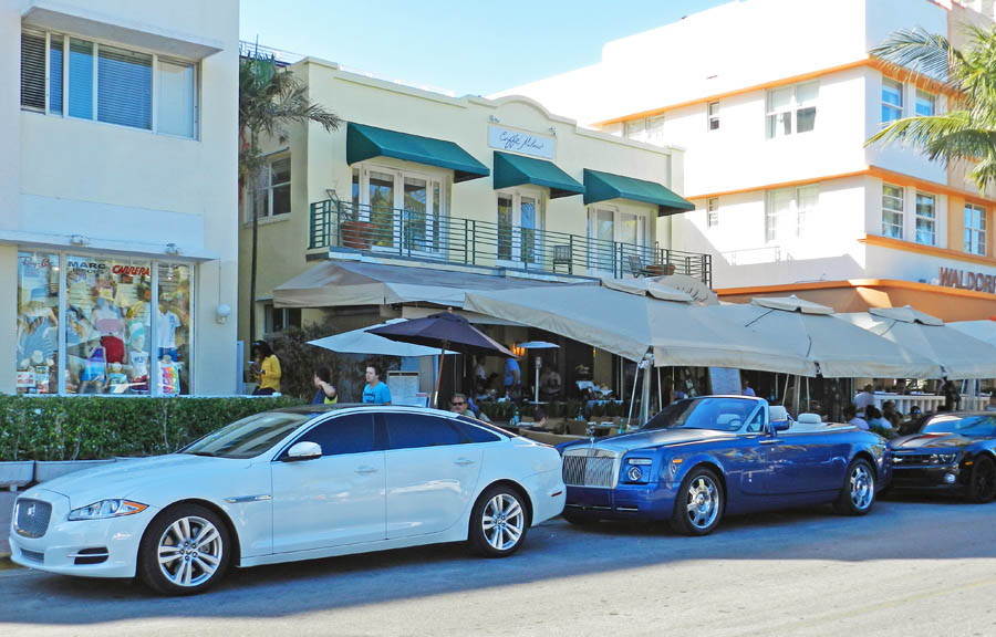 Fancy cars along Ocean Drive in Miami Beach.