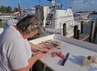 Nancy bravely fileting fresh pompano next to Sno' Dog in Venice.