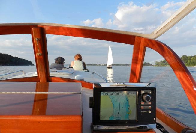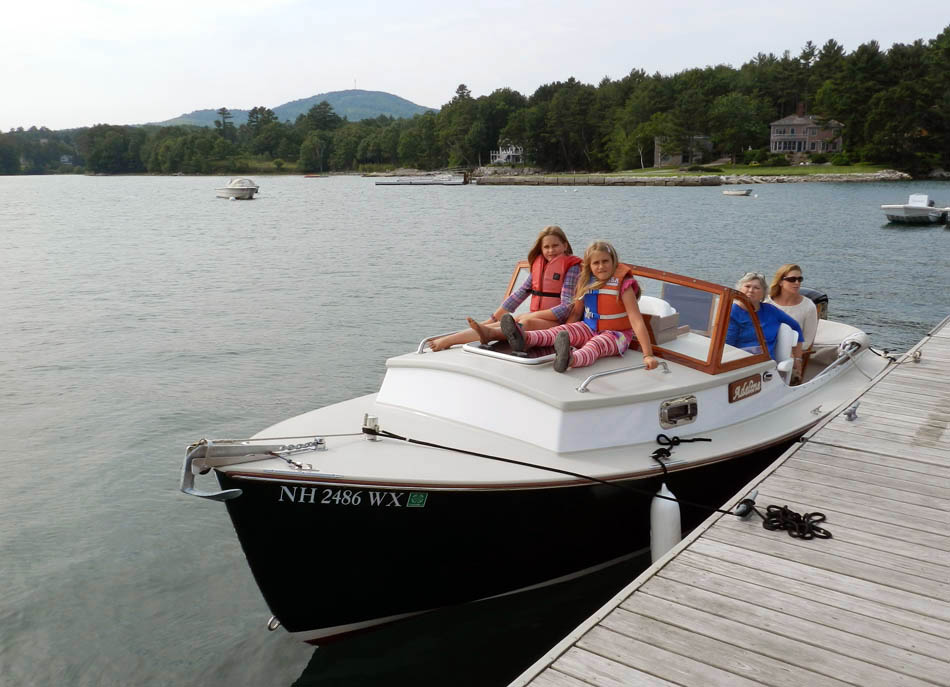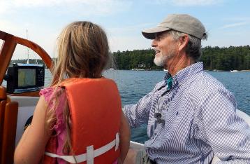 A beautiful afternoon for a cruise on Casco Bay - at 17.6 kts! Grandkids Hal and Neddy on bow.