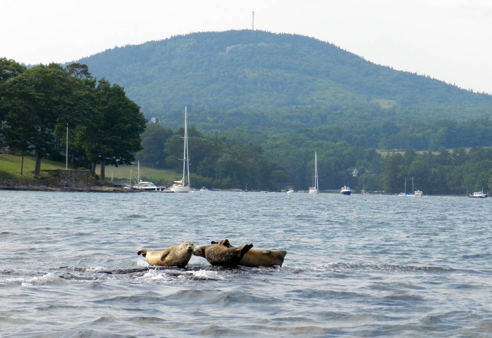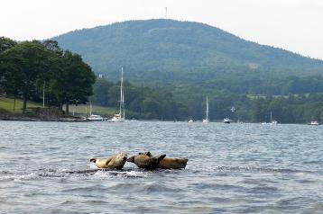 Harbor seals on a rock in Blue Hill Bay, Blue Hill in background.