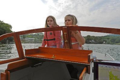 Granddaughters Lucy and Georgia on the bow.